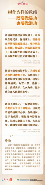 今年是“十五五”开局之年,如何确保开好局、起好步?近日,习近平总书记在省部级主要领导干部学习贯彻党的二十届四中全会精神专题研讨班开班式上这样强调,要树立和践行正确政绩观,坚持从实际出发、按规律办事,自觉为人民出政绩、以实干出政绩。