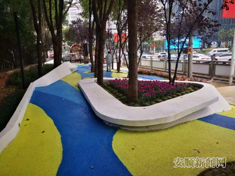 不止于此,安顺的口袋公园始终坚持“因地制宜、差异化打造”,结合不同区域人群特征,精准匹配群众需求。紧邻北山小区的北山口袋公园,聚焦居民日常休憩需求,对小区旁的城市“零碎地”进行空间改造与功能提质,增设绿植花卉、休闲座椅与健身设施,打造出一步一景的街边游园,成为居民茶余饭后散步歇脚、强身健体的好去处;位于西秀区黄果树大街与龙宫大道交叉路口的燕安公园,原始地貌为一片林木杂乱且封闭的道路节点闲置绿地,通过微改造,将原始林木梳理移植,形成了通透型的城市微空间,再采用彩色透水混凝土打造步道,搭配艺术坐凳与特色绿植,既美化了城市街景、提升了道路节点颜值,又为过往行人和周边居民提供了便捷的休憩空间,成为城市路口的一道亮眼风景线……